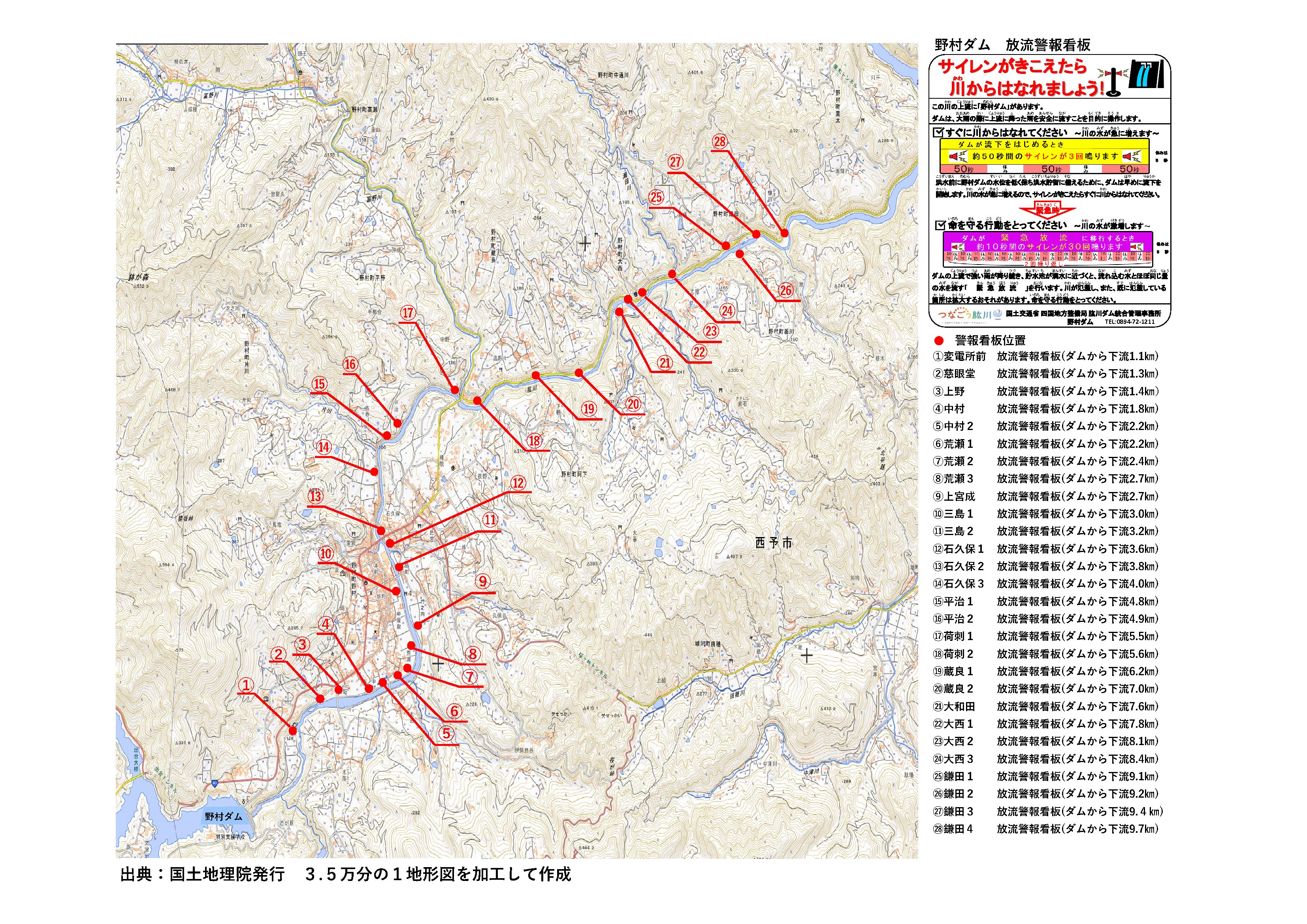ダムが放流したときの注意事項やダムの放流開始を知らせる方法を示した立看板です。川沿いに28箇所あります。
