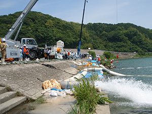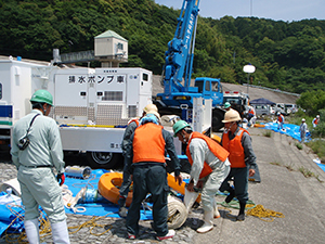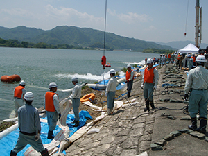 当日の訓練には、操作に携わる建設業者と県、市町村職員や水防団員など約90名が参加し、一連の作業の流れと手順を確認しました。