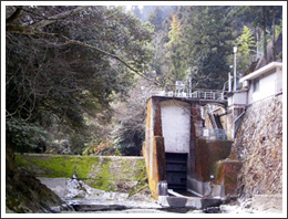 取水堰は、石手川の水を、発電用の水として取り込む所。 「沈砂池(ちんしゃち)」で水の中の石や砂を取りのぞき、落差を得るために「水そう」に水をためておき、「水圧鉄管(すいあつてっかん)」で有効落差171mにより発生する圧力水を水車へ導く。 湯山発電所において、水車の回転エネルギーを「発電機」で電気エネルギーに変換する。 取水堰から湯山発電所まで、石手川の水は、約6kmの旅をする。
