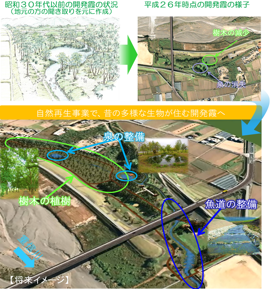 かつての開発霞は動植物が多く生息する、湿地帯でした。しかし昭和48年ごろに実施した堤防工事により、泉や木が消失し、かつての自然環境はなくなってしまいました。 そこで、平成26年度から自然再生事業を実施しています。