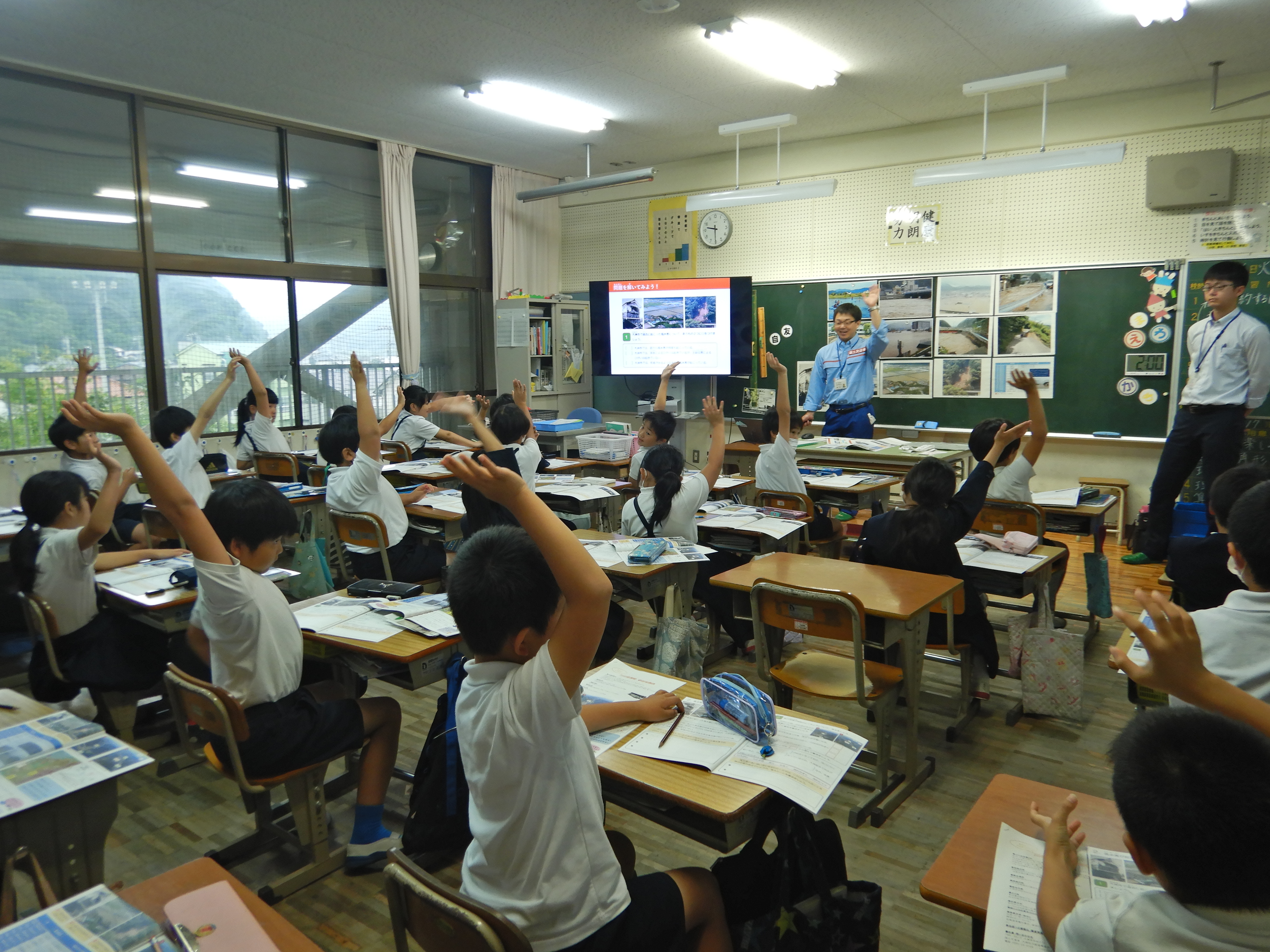 小学校4年生を対象に、肱川の「洪水」をテーマとした防災教育教材を提供し、事務所職員が講師となり、単元「自然災害からくらしを守る」についての学習を行いました。