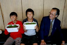 子供たちの体験会で植えた鉢植えを持った平小学校の児童と、武井先生(武井近三郎園芸研究所 主宰 武井 道夫氏)の記念撮影 |