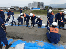 講習では、土のう作り、ロープワーク、月ノ輪工、改良積み土のう工について行い、一つ一つの作業内容を確認しながら、真剣に取り組んでいました。
