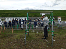 ・旧吉野川徳長箇所の堤防耐震工事現場における杭打ち箇所の測量体験