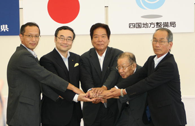 四国横断自動車道の小松島IC(仮称)~徳島東IC(仮称)間(約7.7km)のうち、小松島市江田地区(約0.8km)及び中田地区(約0.3km)の設計協議が合意したことから、平成24年8月21日(火)に合同設計協議調印式を行いました。
