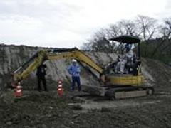 体験セミナーの内容は、(1)生コン品質管理、(2)センター杭設置、(3)床掘作業で各40分程度実施しました。