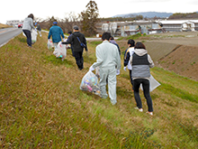 国土交通省のメンバーも含め、21名の方に集まって頂き、堤防脇に菜の花が咲き、春の陽気を感じる約700mの区間を歩きながらゴミを回収しました。ご協力いただき、誠にありがとうございました。