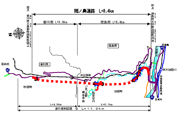しかし、徳島県と香川県の県境に位置する猪ノ鼻峠は、讃岐山脈の急峻な地形を横断し、中央構造線沿いの地すべり区間でもあることから、災害危険箇所が集中し、事前通行規制区間となっています。また、急峻な地形から、線形不良による交通事故の多発、冬季には凍結・積雪による交通規制等、安全性、定時性の問題を抱えています。
