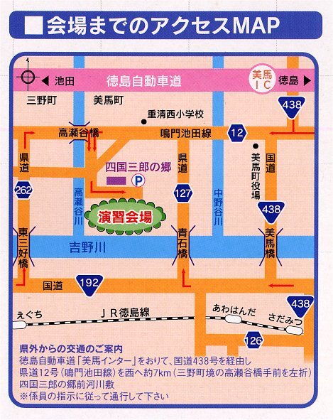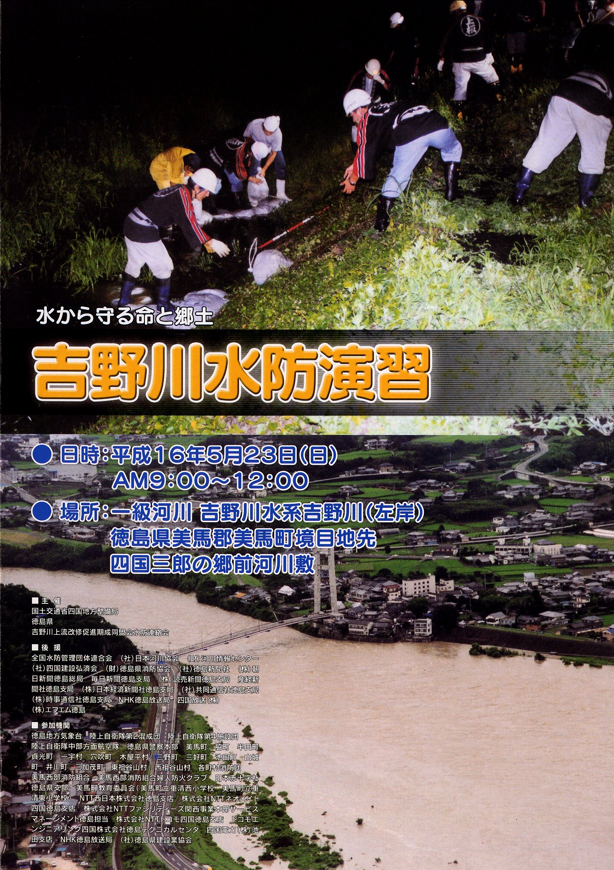 ■主 催 国土交通省四国地方整備局 徳島県 吉野川上流改修促進期成同盟会水防連絡会 ■後 援 全国水防管理団体連合会 (社)日本河川協会 (財)河川情報センター (社)四国建設弘済会 (財)徳島県消防協会 (社)徳島新聞社 (株)朝 日新聞徳島総局 毎日新聞徳島支局 (株)読売新聞徳島支局 産経新 聞社徳島支局 (株)日本経済新聞社徳島支局 (社)共同通信社徳島支局 (株)時事通信社徳島支局 NHK徳島放送局 四国放送(株) (株)エフエム徳島 ■参加機関 徳島地方気象台 陸上自衛隊第2混成団 陸上自衛隊第4施設団 陸上自衛隊中部方面航空隊 徳島県警察本部 美馬町 脇町 半田町 貞光町 一宇村 穴吹町 木屋平村 三野町 三好町 池田町 山城町 井川町 三加茂町 東祖谷山村 西祖谷山村 各町村消防団 美馬西部消防組合 美馬西部消防組合婦人防火クラブ 日本赤十字社 徳島県支部 美馬町教育委員会 (美馬町立重清西小学校 美馬町立重 清東小学校) NTT西日本株式会社徳島支店 株式会社NTTネオメイト 四国徳島支店 株式会社NTTファシリティーズ関西事業本部サービスマ ネージメント徳島担当 株式会社NTTドコモ四国徳島支店 ドコモエンジ ニアリング四国株式会社徳島テクニカルセンタ 四国電力(株)池田支店 NHK徳島放送局 (社)徳島県建設業協会 |