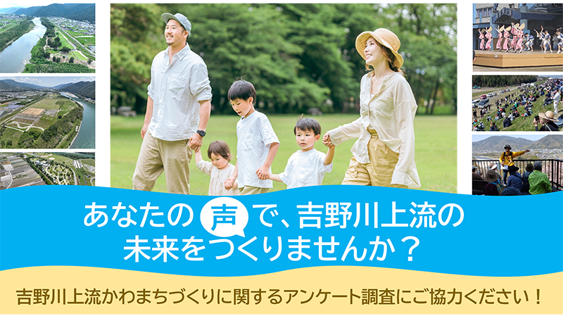 現在、吉野川上流かわまちづくり計画の対象地域のさらなる発展や活用を図るため、対象地域への印象や対象地域を活用した取り組みの提案についてアンケート調査を実施しています。