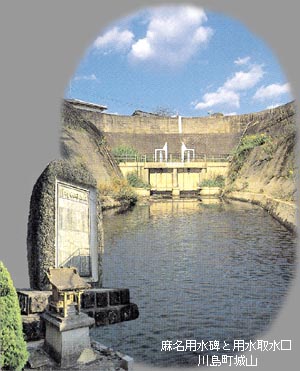 ところが、明治三十七年(1904)にこの地域一帯が大干ぱつに襲われた。これがきっかけとなって、麻名用水計画が再浮上し、実現要請の気運が一気に高まったのである。用水による米作栽培を強く要望する森山・牛島・浦庄・高原・石井の五か町村(のち高川原村が加入)の水利組合を組織し、当初の岩津の淵から取水するという案を改め川島城山より引水するという計画が立てられた。翌三十八年(1905)には「紀念麻名普通水利組含」が結成され、管理者に井内恭太郎が就任した。このとき井内は名西郡長の職にあり、主唱者みずからがその実行責任者として敏腕をふるうことになったのである。ちなみに「紀念」と冠せられたのは、この年の日露戦争の「戦勝」を記念してのことである。