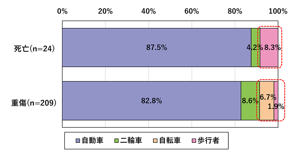 死亡事故・重傷事故ともに、自転車・歩行者関与事故が全体の約1割を占めており、死傷事故発生割合(下図参照)と比較すると、自転車・歩行者が関与する事故は重大事故に繋がりやすい傾向が確認できます。