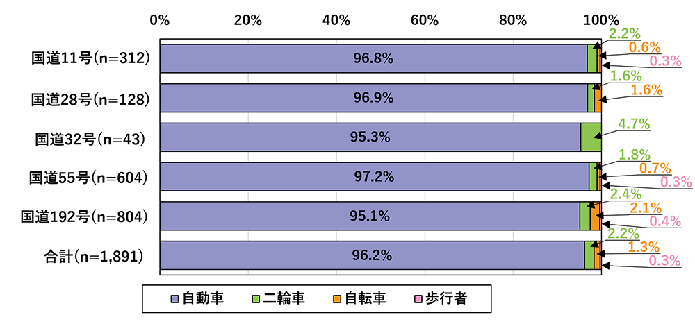 各路線とも、自動車が関与する事故の割合が9割超えの状況です。