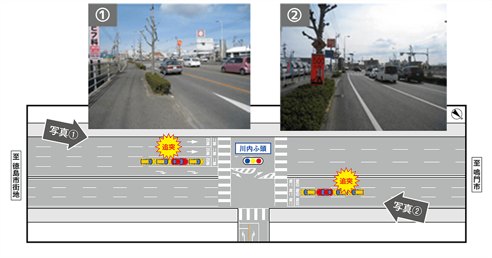 交差点に接近する際の走行速度が速いため、信号待ちによる減速・停止を行う前方車両に対応できず、後続車両が追突する事故が多発していました。