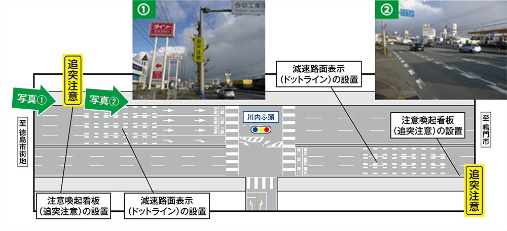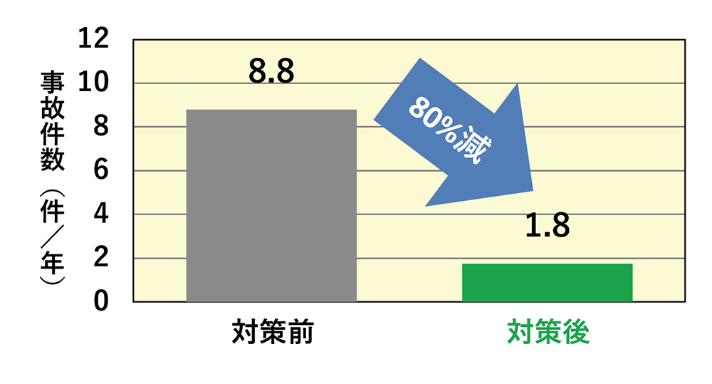 交差点流入部に減速路面表示(ドットライン)と注意喚起看板(追突注意)を設置したことにより、事故件数が約80%減少しました。