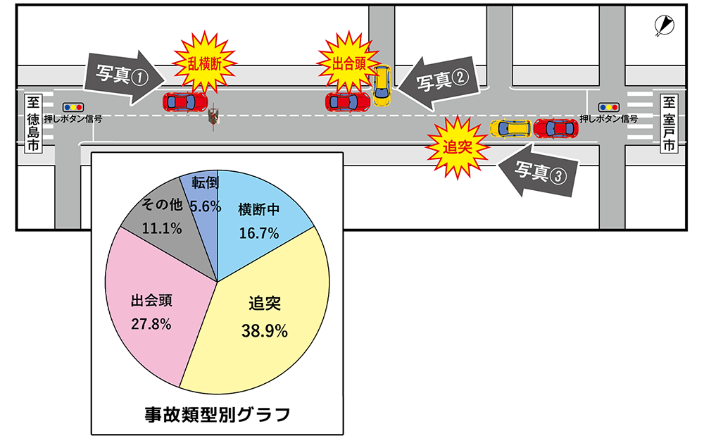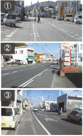 沿道の両側に店舗が存在し、横断歩道以外での歩行者・自転車の乱横断が多く、追突事故や出会頭事故が多発していました。