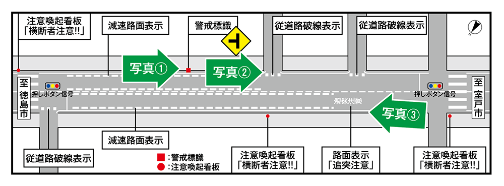 歩行者や自転車の乱横断や追突事故、出会頭事故に対して、ドライバーへの注意を喚起するため、減速路面表示や看板等を設置しました。