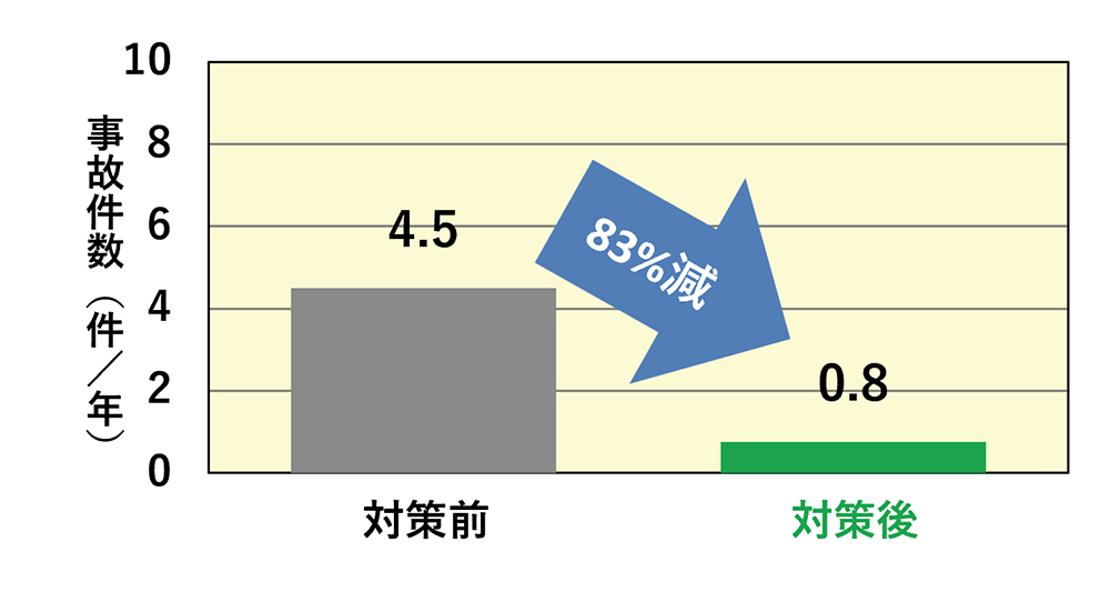 注意喚起看板や減速路面表示の設置により、事故件数が約83%減少しました。