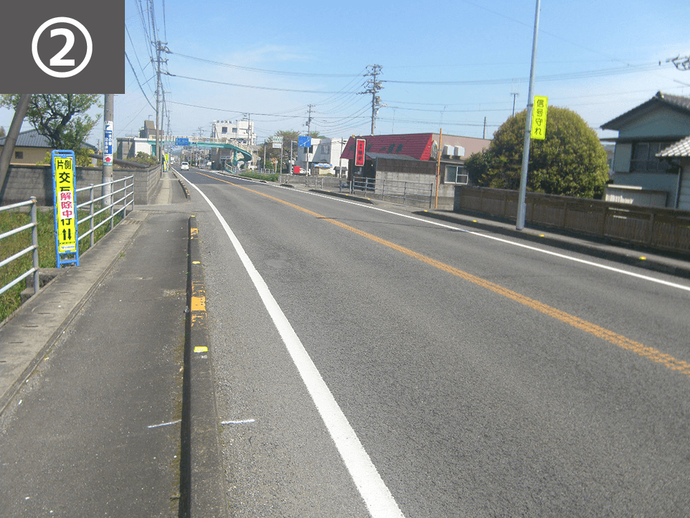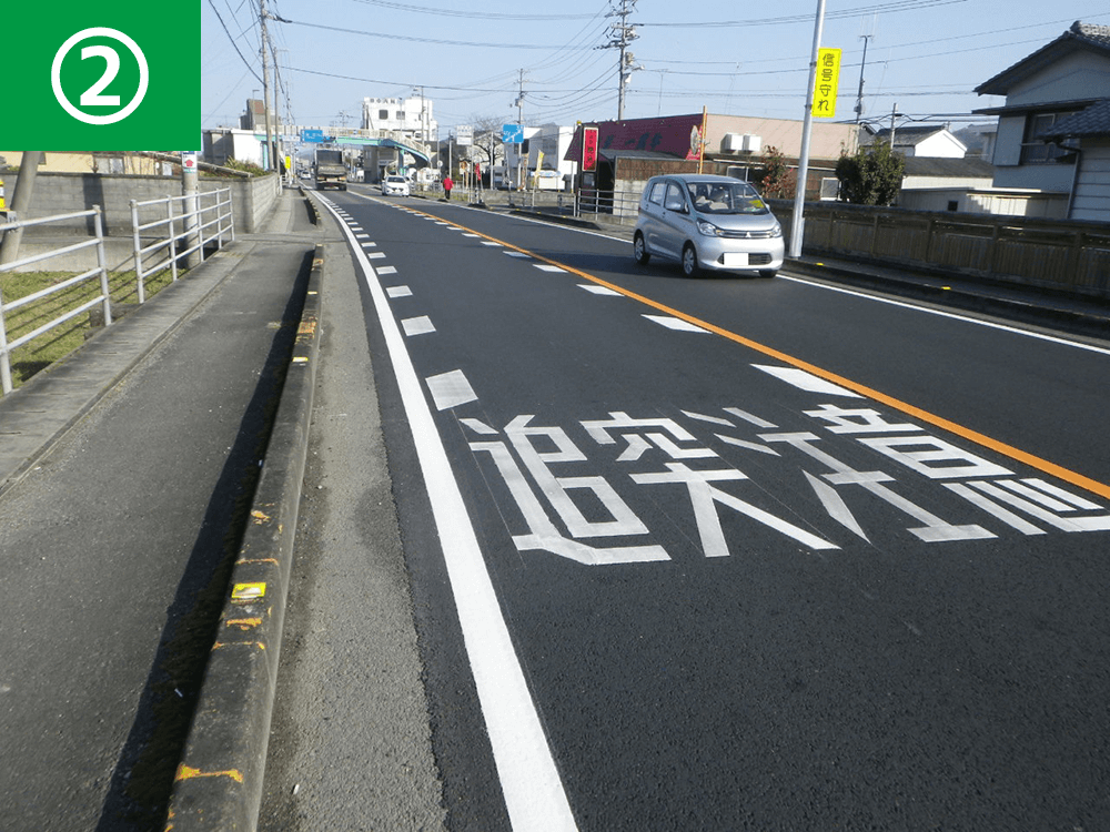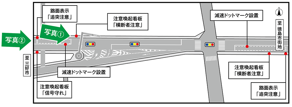 減速ドットマークや速度抑制に関する路面表示等を設置し、交差点の進入速度を減速させ、無理な交差点進入を抑制しました。