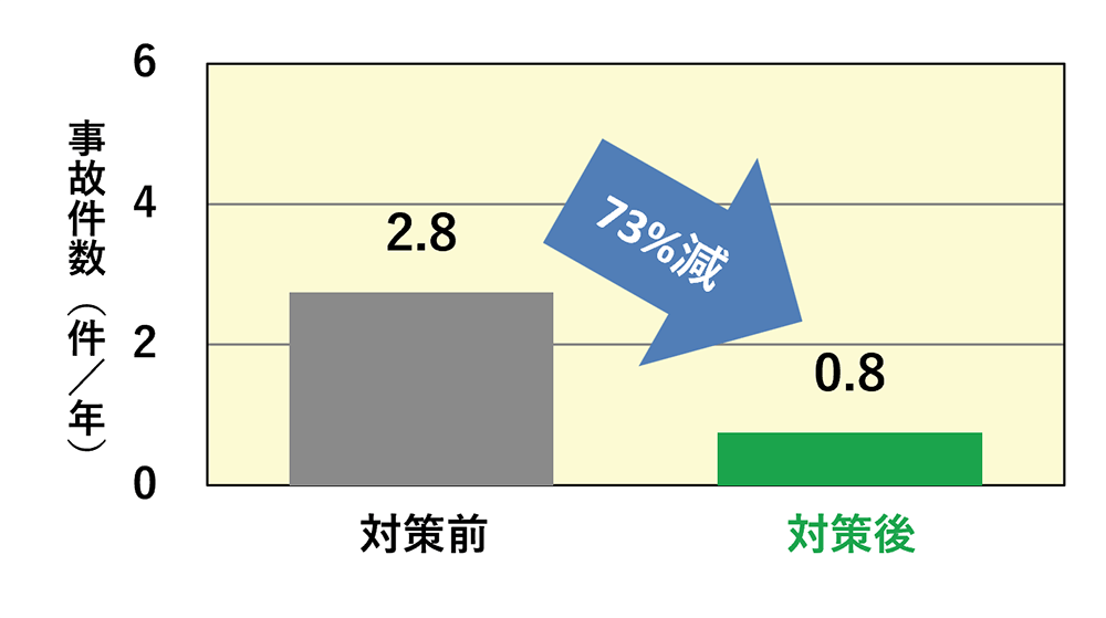 減速ドットマークや速度抑制に関する路面表示、注意喚起看板の設置により、事故件数が約73%減少しました。