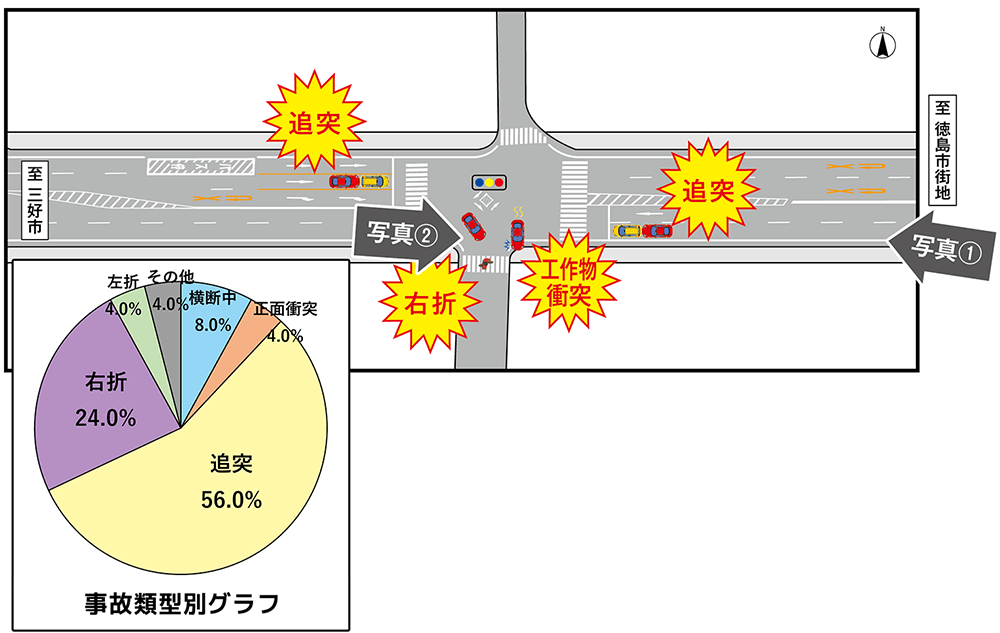 更には、南北方向の従道路が食い違っていることから、南北方向の交差点内の進行先が分かりにくく、工作物に衝突する事故が発生していました。