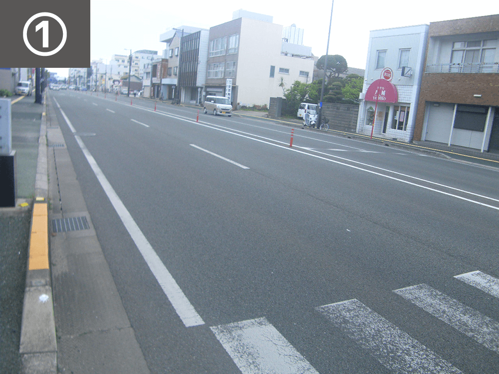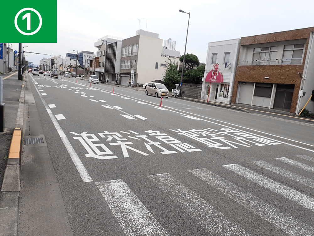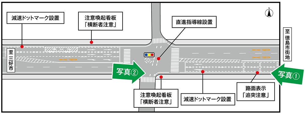 減速ドットマークや路面表示、注意喚起看板や直進指導線の設置により、事故件数が約68%減少しました。