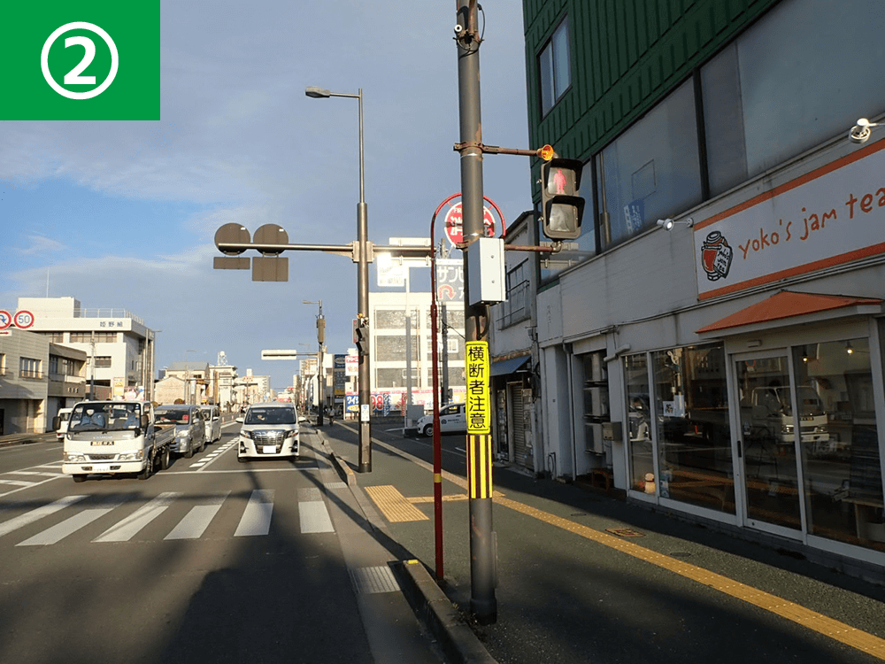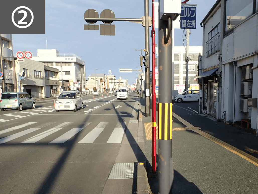 また、右折車に対して横断者の存在を注意喚起すべく、注意喚起看板を設置し、交差点内に直進指導線も設置しました。
