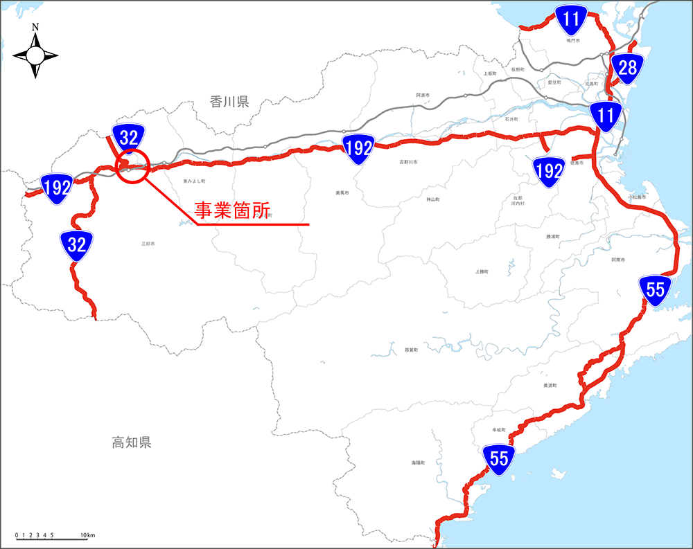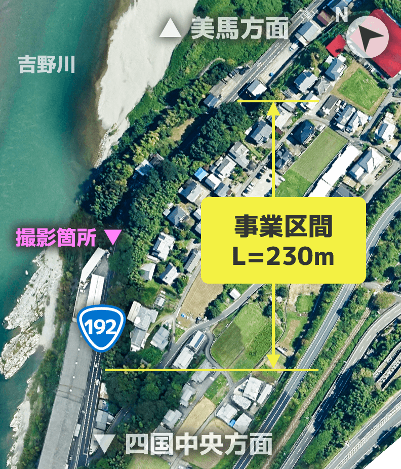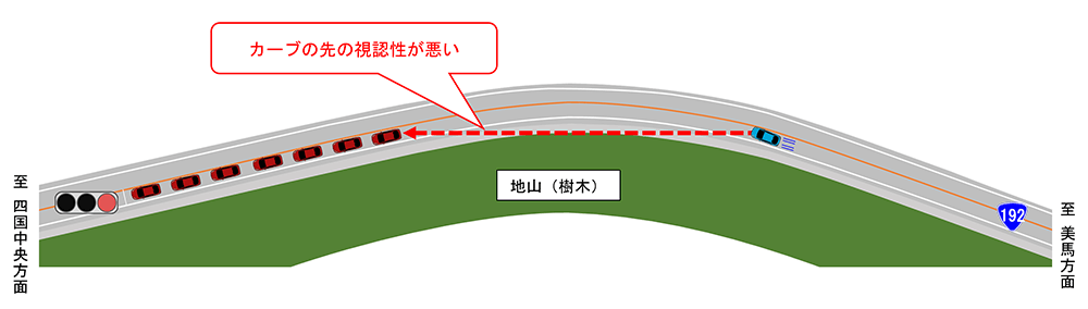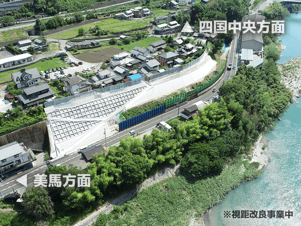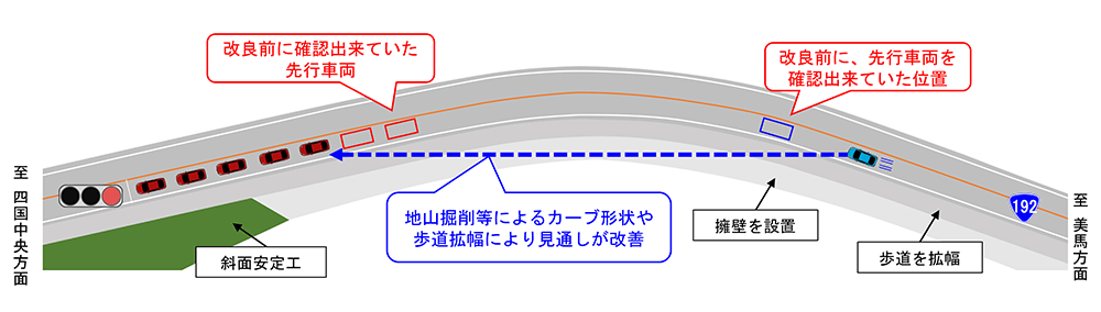 一般国道192号西井川視距改良事業区間では、吉野川に並行するようにカーブ区間が存在しており、視距不足のため、カーブの先で信号待ち等により減速・停車する車両に追突するような事故が多発する箇所でした。そこで、視距改良により交通の円滑化を図り、安全な交通環境を確保する対策を実施しています。