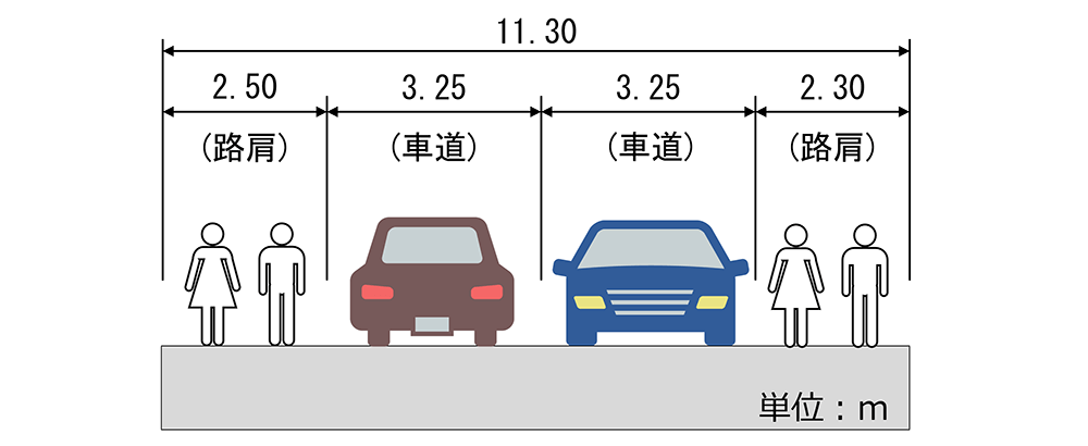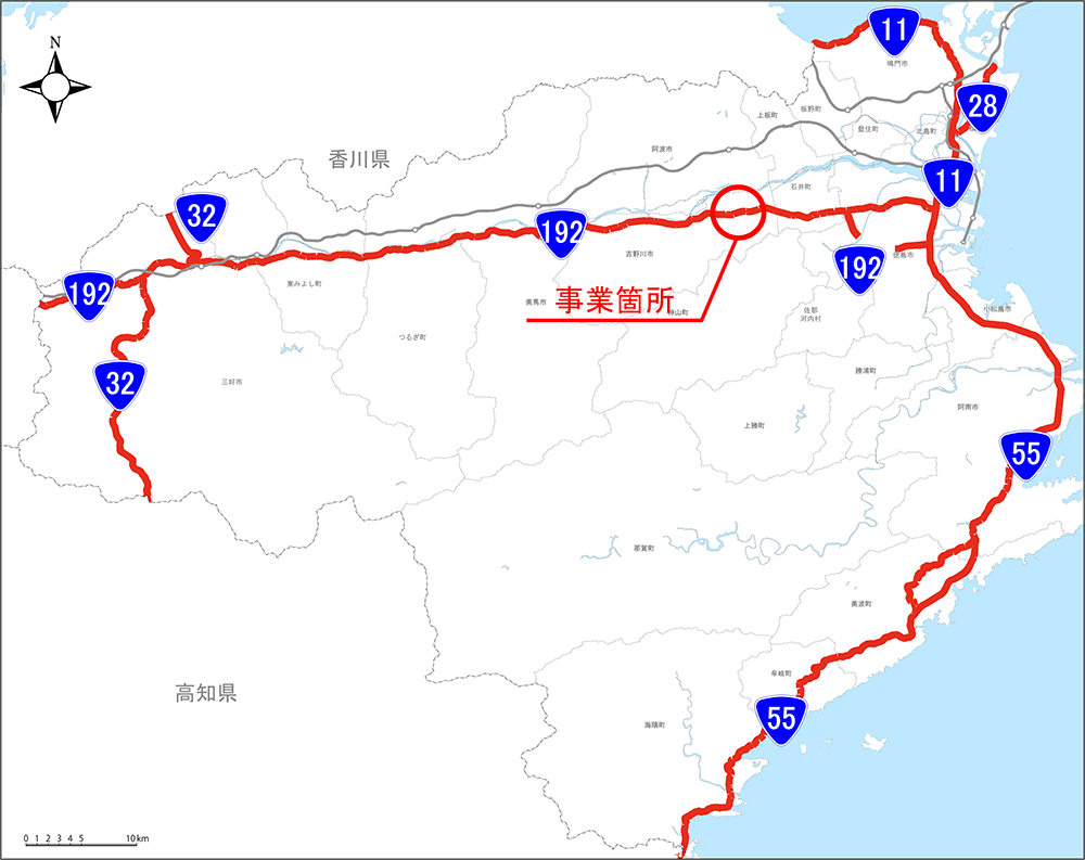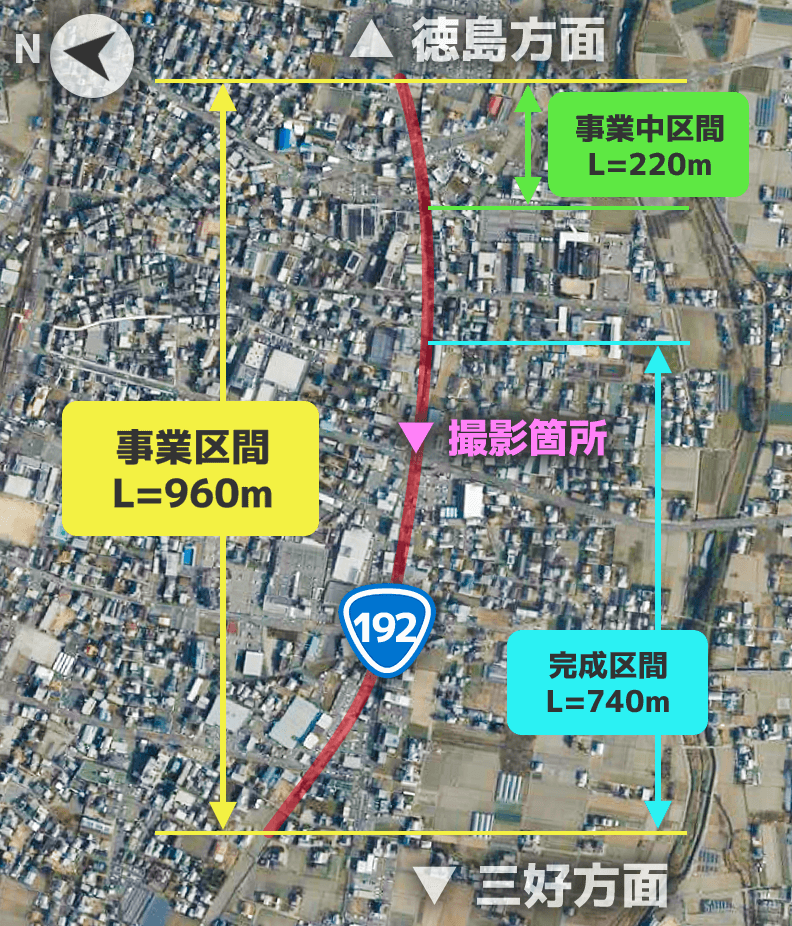 一般国道192号の吉野川市鴨島町上下島付近は、沿道施設への出入りや交差点での右左折時の事故が発生しています。現在事業中の区間には歩道が整備されていませんが、朝夕の通学・通勤時には歩行者・自転車と車両が多く、すれ違いや追い抜き等で自動車との接触の危険があります。