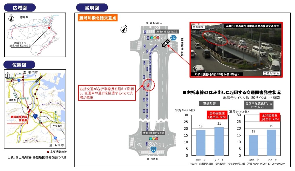 現在、国道55号勝浦川橋北詰交差点(北行き方面)において、右折交通が右折車線長を超えて滞留し、直進車の通行を阻害することで渋滞が発生している状況です。