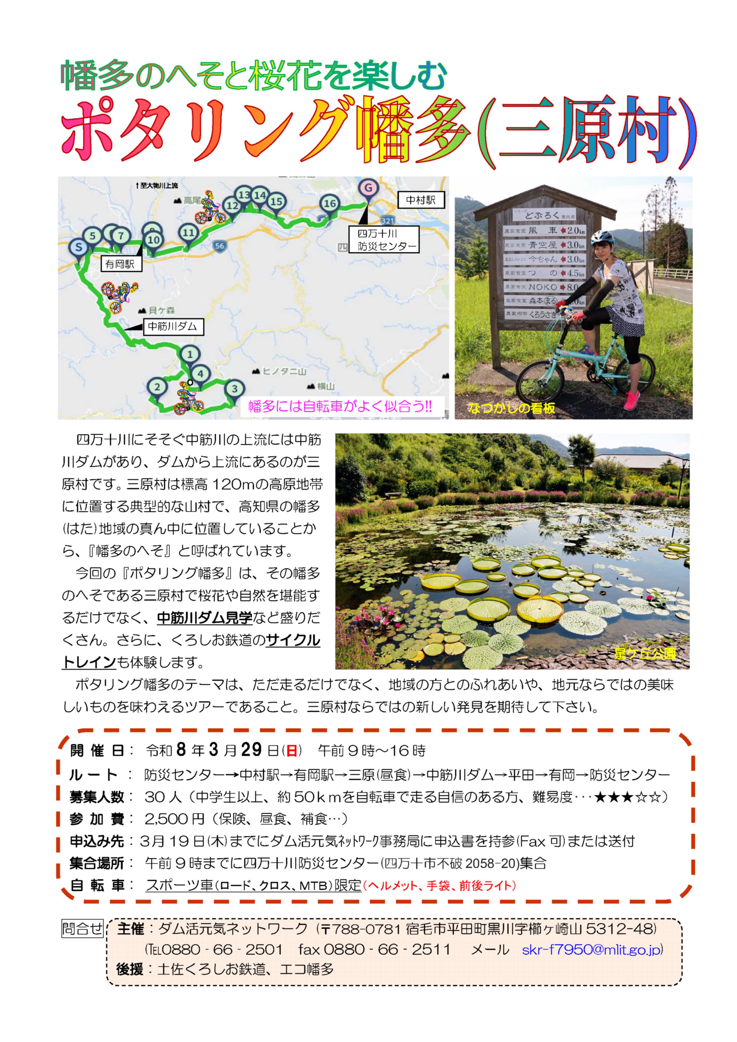 ■参加に際しては、この申込書を申込先へ郵送・FAX または持参してください。参加費は当日いただきます。 申込先:ダム活元気ネットワーク事務局(渡川ダム統合管理事務所) 〒788-0781 宿毛市平田町黒川字櫛ヶ崎山5312-48 TEL0880‐66‐2501 FAX0880‐66‐2511