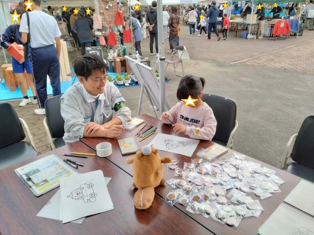 塗り絵コーナーでは、子ども達に「ひじまる」の絵に好きな色の色鉛筆を使って塗り絵をして