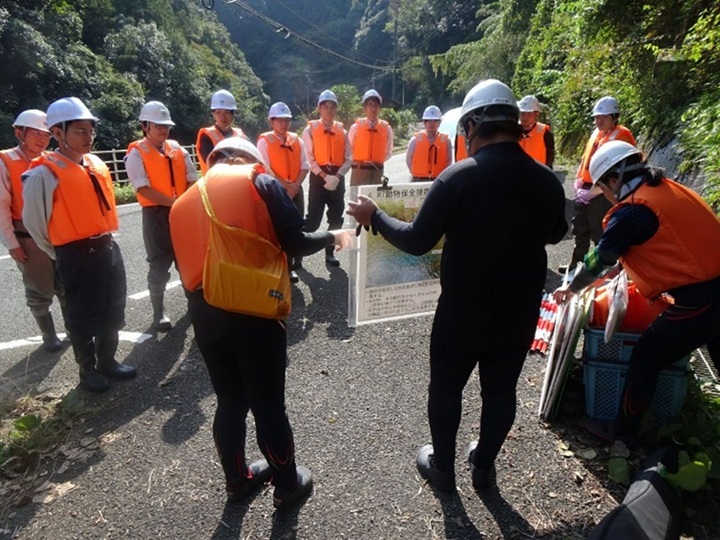 今回は山鳥坂ダム建設事業の環境保全措置の一環で、アオサナエの新規生息地を整備するために河辺川