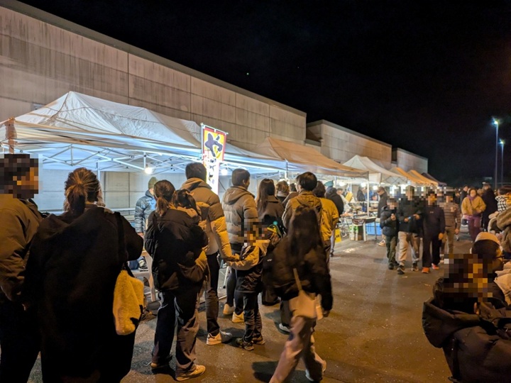 鹿野川ダムの天端道路にはおでんやうどんなどの屋台が並び、特に焼き芋は長い行列ができるほどの人気で、