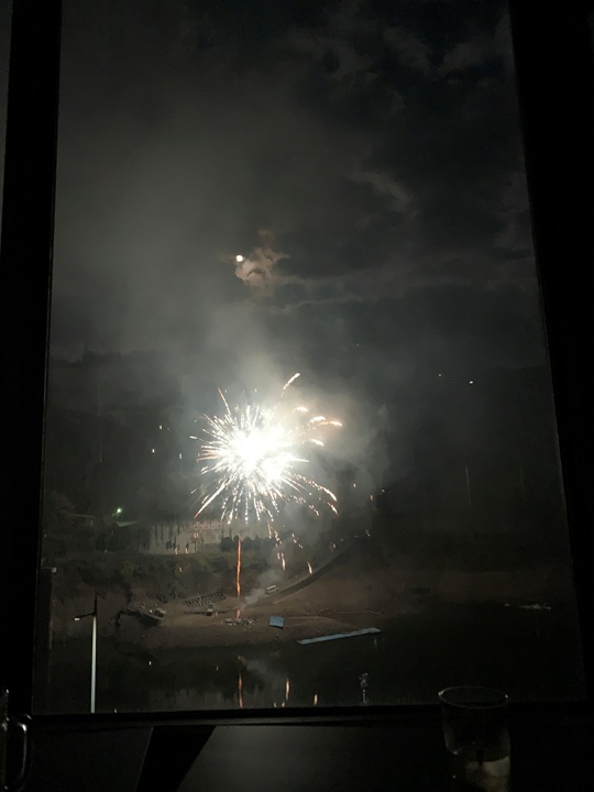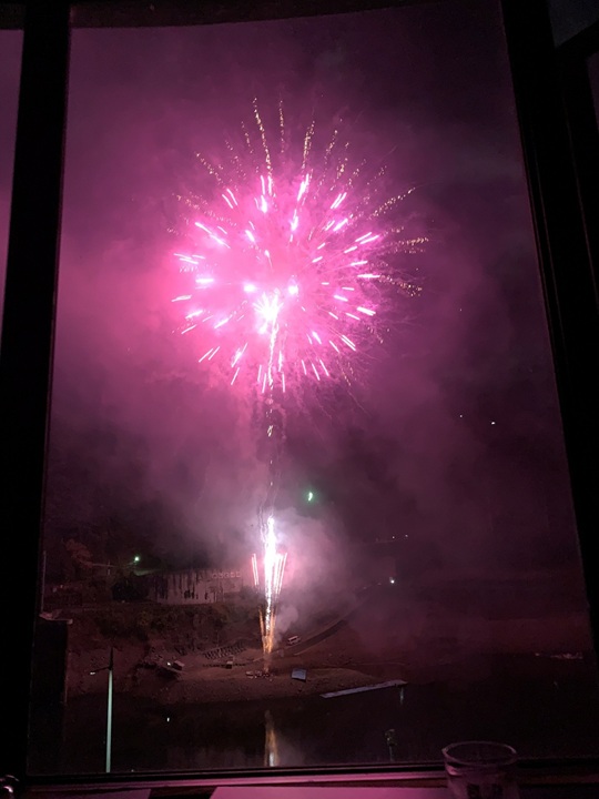 こちらはダムの上から見た花火です。ダム湖に映る花火も一緒に楽しめ、幻想的な光景でした。