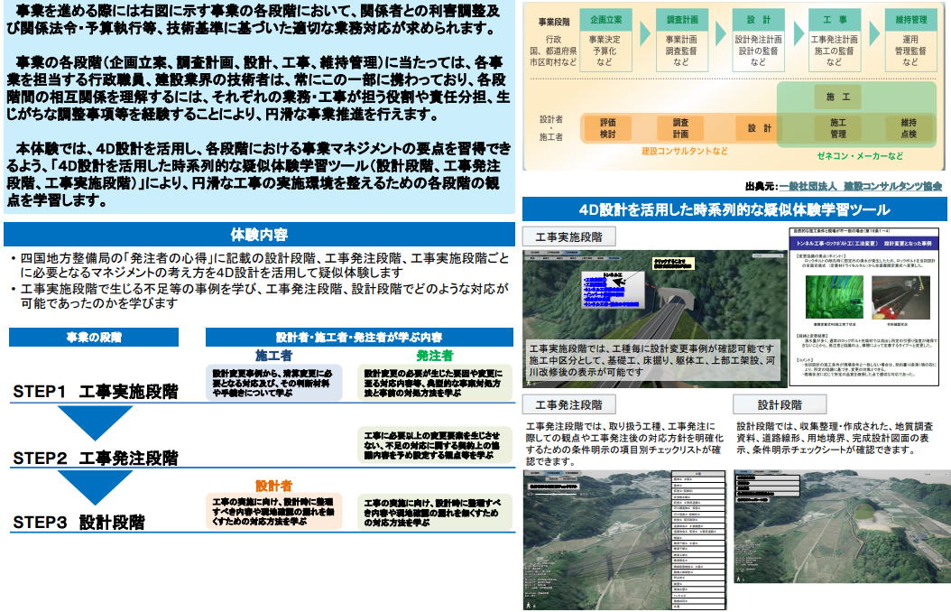 事業の各段階(企画立案、調査計画、設計、工事、維持管理)に当たっては、各事業を担当する行政職員、建設業界の技術者は、常にこの一部に携わっており、各段階間の相互関係を理解するには、それぞれの業務・工事が担う役割や責任分担、生じがちな調整事項等を経験することにより、円滑な事業推進を行えます。