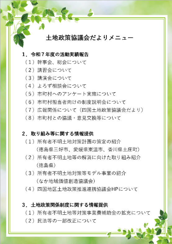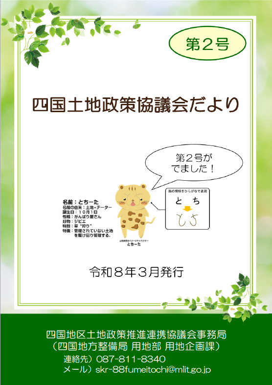 「四国土地政策協議会だより」の名称で、四国地区土地政策推進連携協議会の活動内容や所有者不明土地問題をはじめとした土