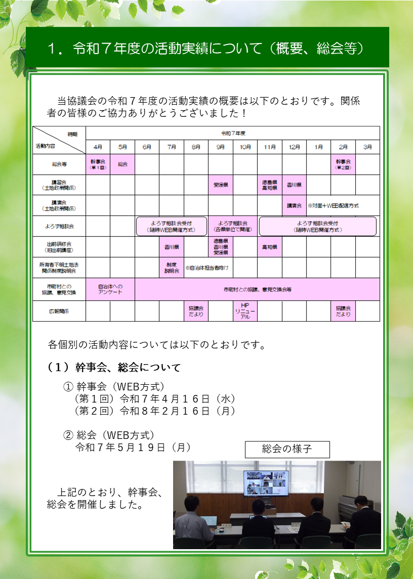1.四国地区土地政策推進連携協議会の紹介 2.令和7年度の活動状況について 3.その他(情報提供等) |
